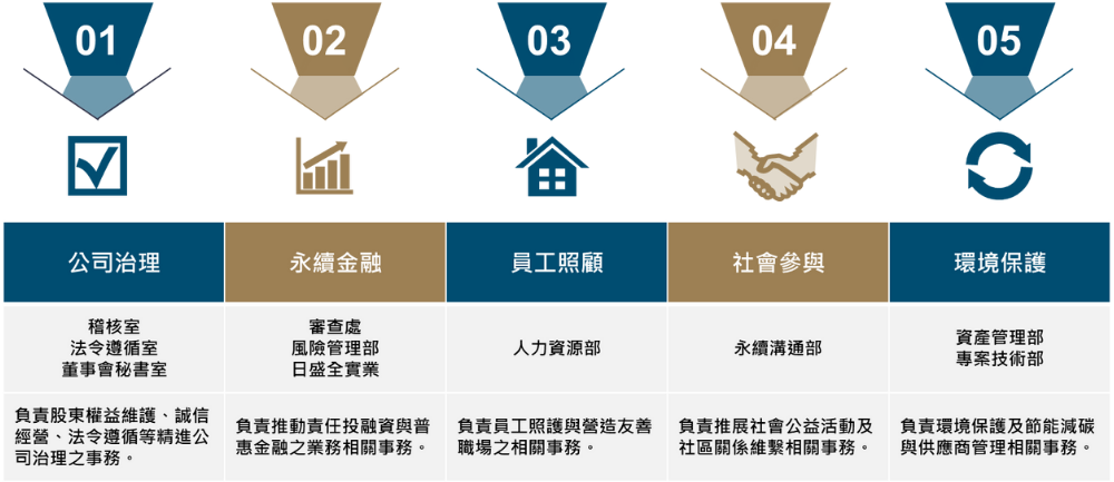 為落實企業社會責任、建構永續營運環境,日盛台駿於2022年12月設立永續溝通部,作為公司永續發展之專責單位,負責統籌及推動各項永續相關事務。