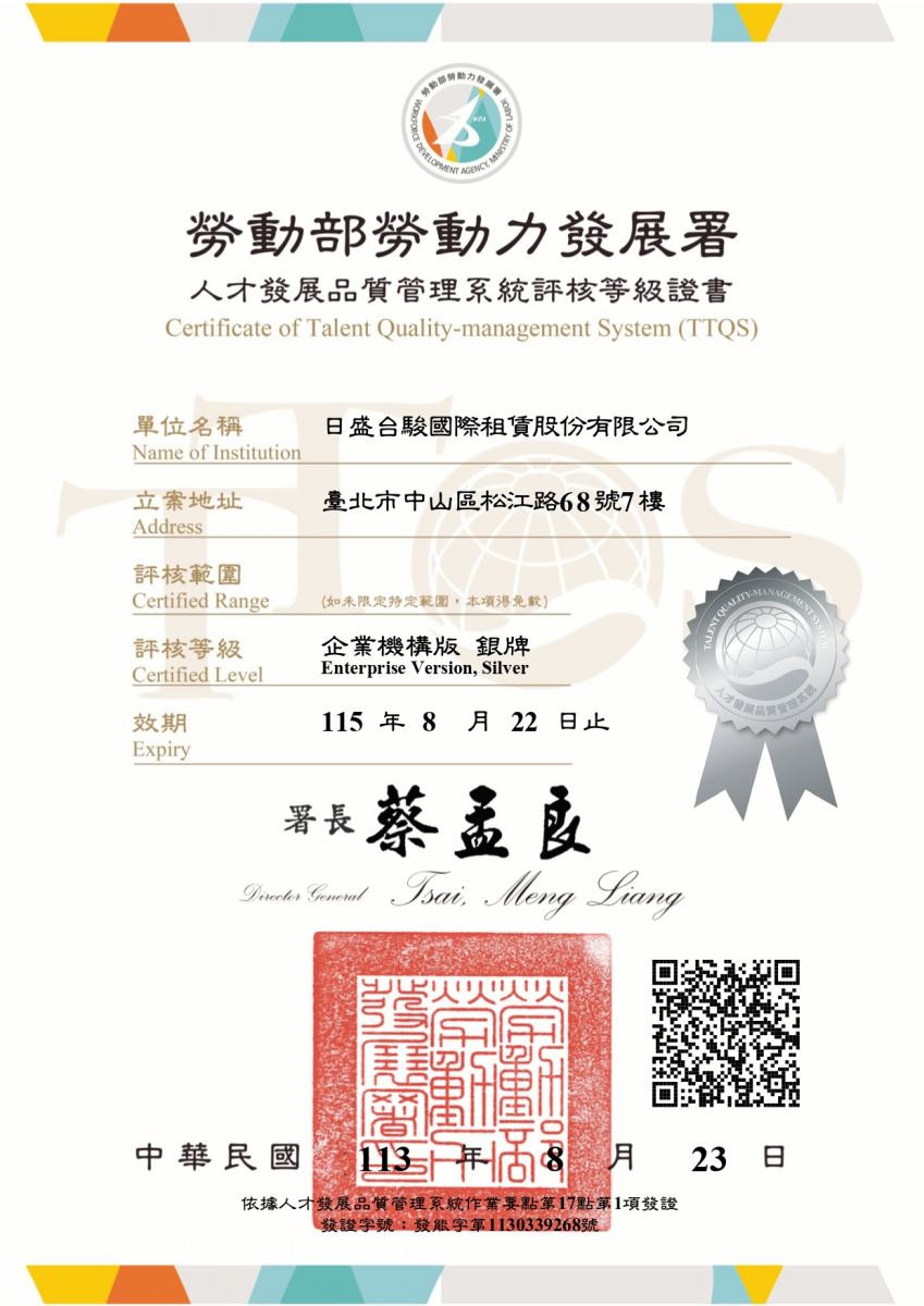 訓練展示-獲頒行政院勞動部2024年「TTQS人才發展品質管理系統」銀牌殊榮。長期以來,日盛台駿的教育訓練初衷以「培養一流的人才」為目標,依循TTQS各項指標優化訓練體系,且因應長期發展策略與同仁成長需求,規劃多元培訓課程。包含高階主管與同仁零距離並肩開發、服務顧客與創新思考,透過實戰帶領與職場經驗傳承,凝聚團隊向心力,共享學習與成長,打造出有溫度的企業文化。